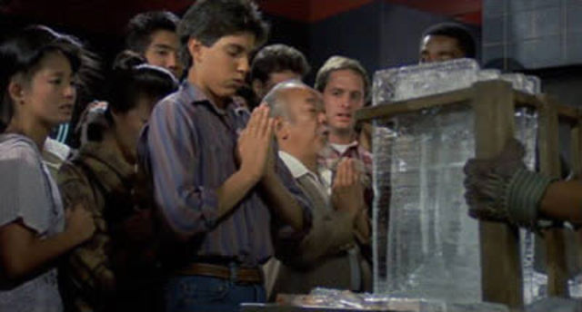 Then later he takes his girl to a bar. She clearly warns him it’s a bad place. Oh before that, he has to stand in the window and watch his enemy train. Just like he did with Johnny in the first one. Back to the bar. As he watches these guys try to break the blocks of ice, he’s talking shit. Telling his girl what they’re doing wrong. Naturally, he’s gonna piss someone off. If Miyagi wasn’t there to talk him through it, he woulda blew it.